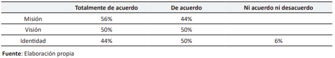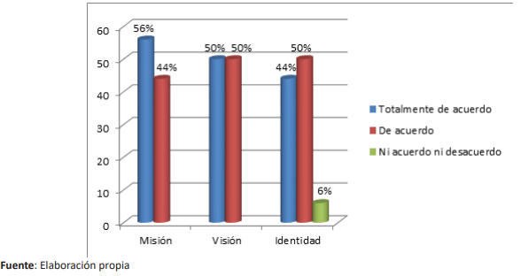 El 56% de los profesionales de enfermería de la investigación están totalmente de acuerdo y el 44% de acuerdo que la Misión en las unidades clínicas, refleja el compromiso con el bienestar tanto del usuario-paciente como de los trabajadores, así como refleja las creencias compartidas del personal de enfermería. En relación a la Visión, se pudo evidenciar que 50% de los profesionales de enfermería están totalmente de acuerdo y la otra mitad están de acuerdo que la visión refleja el compromiso del equipo con la salud de los usuarios; la misma es compartida por los miembros del equipo y muestra sentido de futuro en el crecimiento del equipo de trabajo. En cuanto a la Identidad, se puede señalar que 50% de los profesionales de enfermería declaran estar de acuerdo y el 44% totalmente de acuerdo con las actividades que realiza la institución con el propósito de afianzar la relación con su talento humano y darle un sentido común a la institución; el 6% está en desacuerdo.