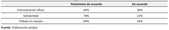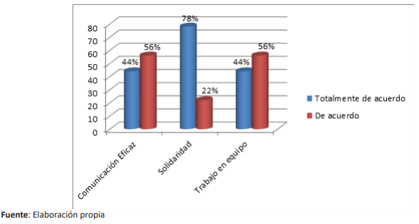 El 78% indicó estar totalmente de acuerdo y el 22% de acuerdo, que la solidaridad mostrada entre los miembros del personal de enfermería favorece tanto la prestación del cuidado al paciente como el crecimiento profesional en la unidad clínica.