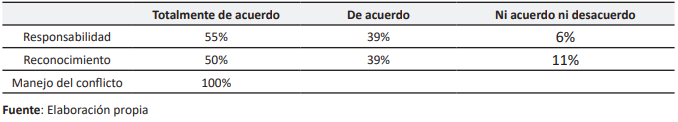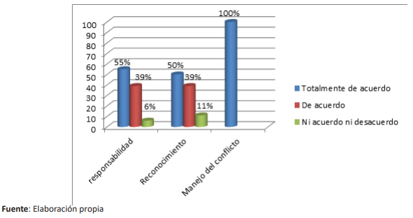 El 100% estuvo totalmente de acuerdo que el manejo adecuado de los conflictos, mostrar tolerancia ante las dificultades y problemas que surgen en la en la unidad clínica entre los miembros del equipo y lograr una resolución efectiva favorece a conseguir unas mejores condiciones de trabajo.