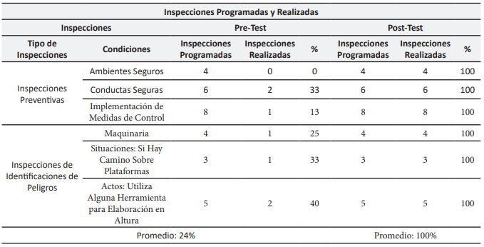 De acuerdo a los resultados expresados en el cuadro anterior se tiene que las inspecciones realizadas en el pre-test están muy por debajo de lo esperado, ya que apenas el 24% de ellas se llevaron a cabo en la organización, sobretodo se presentaron porcentajes de ejecución bajas en las inspecciones relacionadas a las actividades peligrosas. En cambio en el post-test se demostró que todas las inspecciones tanto preventivas como las de identificación de peligros se cumplieron a cabalidad de acuerdo a lo previsto, notándose de esta manera los cambios favorables en pro a los intereses empresariales y a los colaboradores que hacen vida en ella.