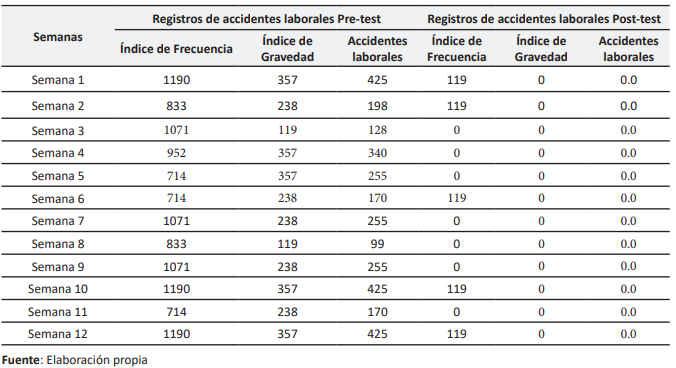 En virtud de los resultados del índice de accidentabilidad, en la etapa del pre-test se presentaban un número de casos considerables por cada 1000 horas de trabajo en la compañía en estudio y luego del post-test, el índice reflejó un 0% de incidencias laborales, demostrando una vez más la efectividad y la eficacia de la implementación del SGSST.