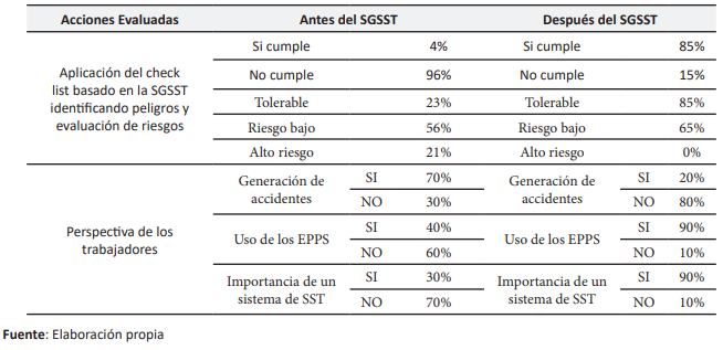 El personal requería de EPPS por lista de solicitudes y no contaban con ello, solo manejaban un 24% de EPPS y se logró mejorar al 100% de EPPS requeridos. Se implementó un plan de auditorías con la finalidad de conocer e intervenir ante un proceso legal. Se implementó una línea de base para la verificación de lineamientos y se espera que a lo largo del tiempo se mantengan al mismo nivel.